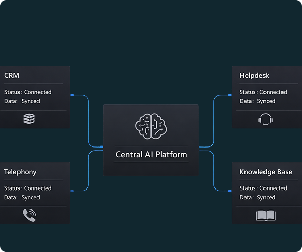 Connects to telephony platforms, CRM systems, service desks, and knowledge bases. Data flows securely between systems using standard APIs. Organizations maintain control over authentication and permissions.