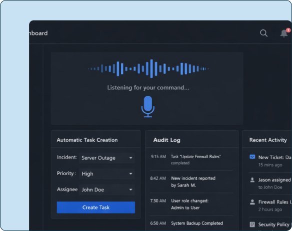incidents, create maintenance requests, or assign follow-up tasks using voice alone. The system captures context automatically, reducing data entry time while maintaining complete audit trails for compliance. Shift leaders can review and prioritise voice-created tasks from their dashboard, ensuring nothing slips through the cracks.