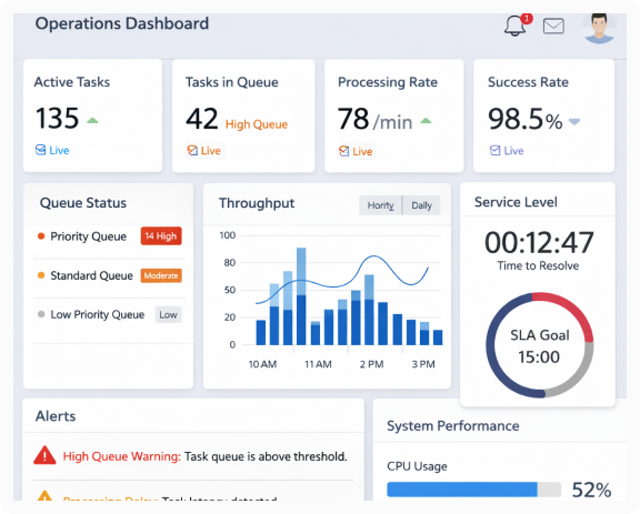 Monitor active queues, throughput rates, and service level timers from a single view. The system surfaces exceptions automatically, so managers can focus on what needs attention rather than searching for problems. Live tiles update as conditions change, reflecting current inventory positions, order status transitions, and resource availability across all connected systems.